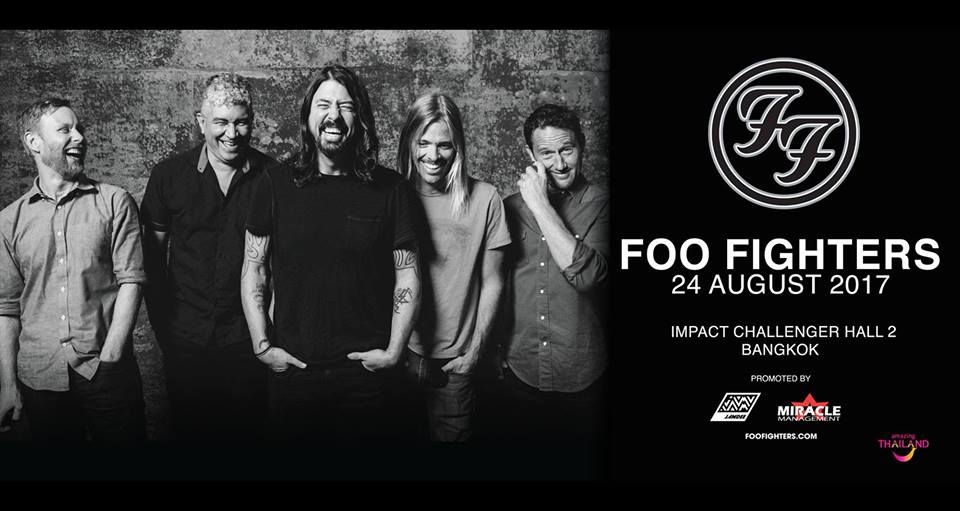 Foo Fighters Live in Bangkok 2017 Date: Aug 24 Location: Challenger Hall, Impact Muangthongtani Ticket: 2,500-6,500 Baht Detail: https://www.facebook.com/events/1869995063241467